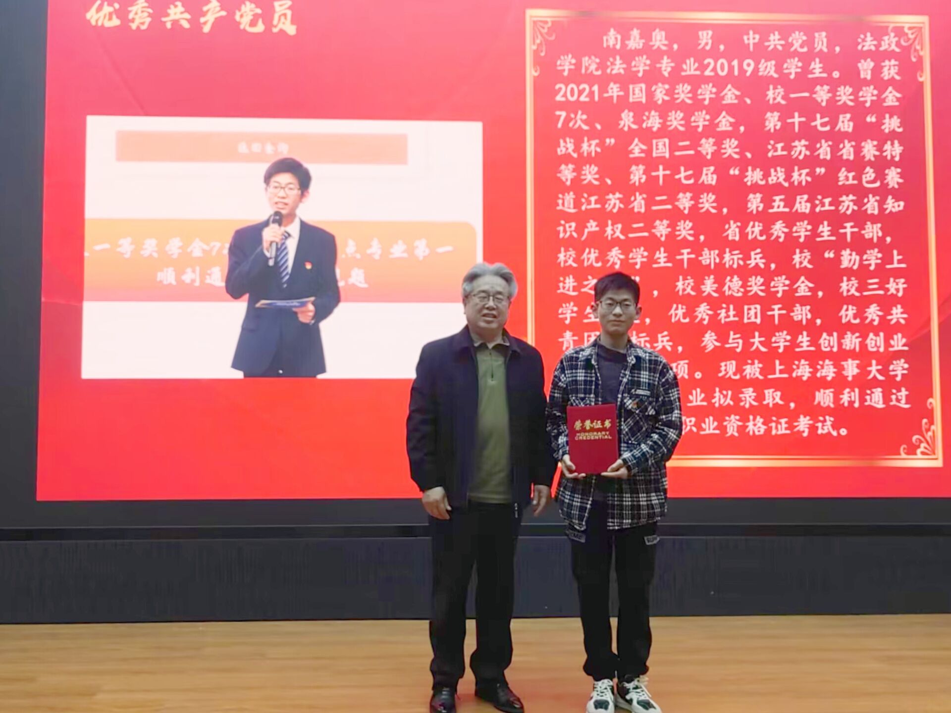 会上,于永恒老师为“优秀共产党员”荣誉称号获得者南嘉奥同学颁发证书,并表示衷心的祝贺。他希望学生党员和学生干部能够以身作则,在学生群体中发挥模范先锋作用,号召全体法政学子苦炼“内功”、立志“决心”、实干“担当”,肩负起新时代赋予我们的重任。