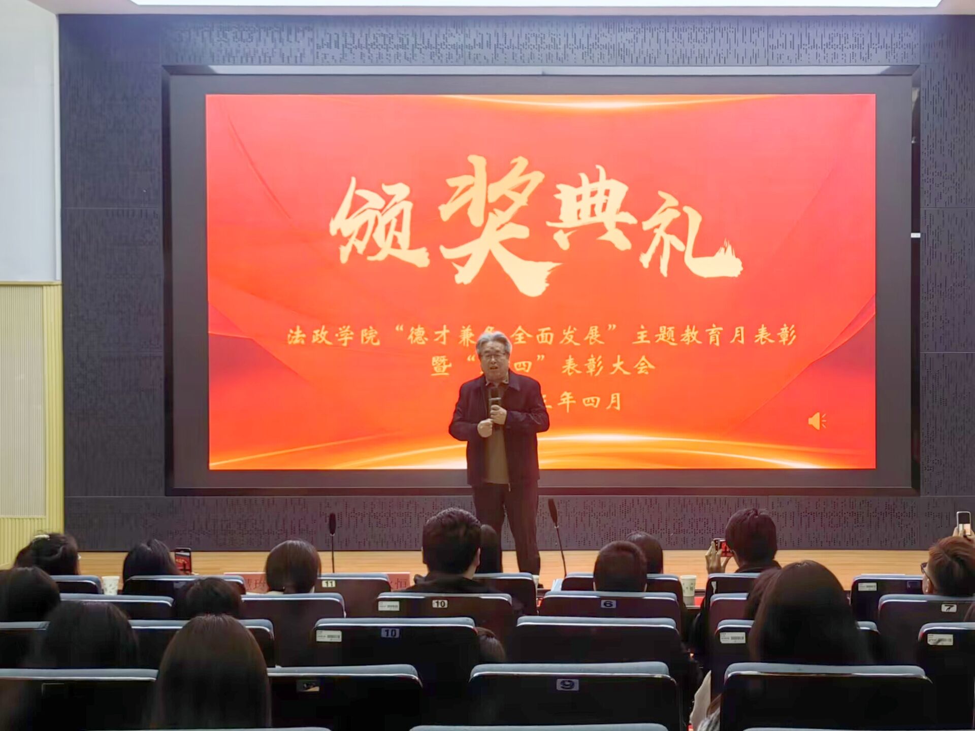 法政学院4月26日电(记者:姜川)4月26日下午,法政学院在逸夫报告厅举行“德才兼备 全面发展”主题教育月暨五四颁奖典礼。法政学院关工委特邀音乐学院退休教师于永恒和党委学工部副部长陈红作为颁奖嘉宾。法政学院党委副书记孙慧玲、全体辅导员以及学生代表参加典礼。