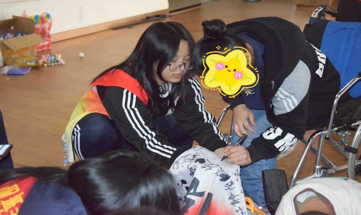 待孩子们享用完蛋糕,趣味游戏紧接着展开。在“筷子夹弹珠”游戏环节,先由志愿者们讲述规则,随后孩子们拿起筷子,尝试夹起玻璃弹珠,游戏过程中孩子们的笑声让现场暖意融融。游戏环节结束后,孩子们在志愿者们的带领下,一同在旗帜上留下他们的签名,每一笔都印刻着彼此的默契与温情。