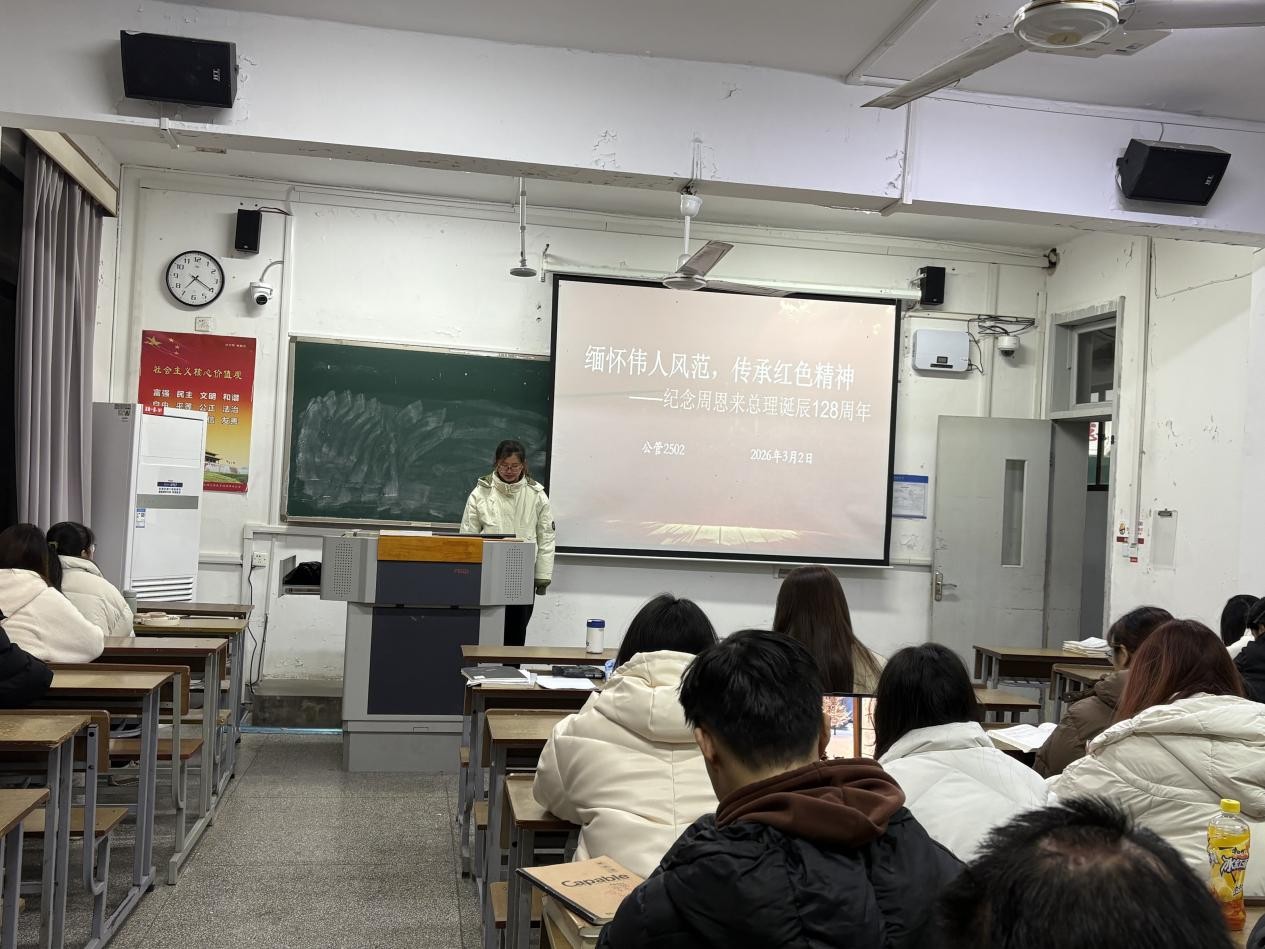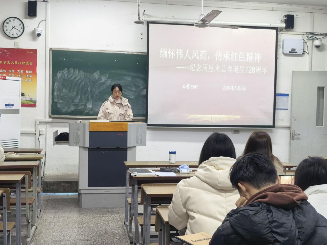 公管院3月2日电(记者 陈灵敏)为深切缅怀周恩来总理的丰功伟绩,传承弘扬伟人精神,3月2日,公管2502班于法政107教室开展了“缅怀伟人风范,传承红色精神”主题创周活动。本次活动由团支书陈灵敏主持,施彦希同学宣讲,2502班全体同学参加。