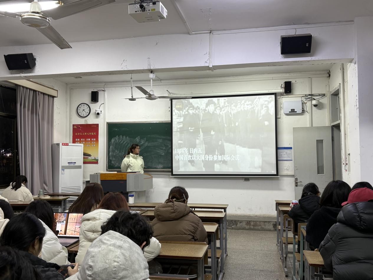 团支书陈灵敏开场致辞,号召同学们以崇敬之心学习周恩来总理的崇高精神。随后,施彦希同学围绕周恩来总理的生平事迹展开分享,鼓励大家将总理精神融入日常学习与实践。活动中,全体同学共同观看了周总理的历史影像,直观感受到了总理鞠躬尽瘁、一心为民的崇高风范。