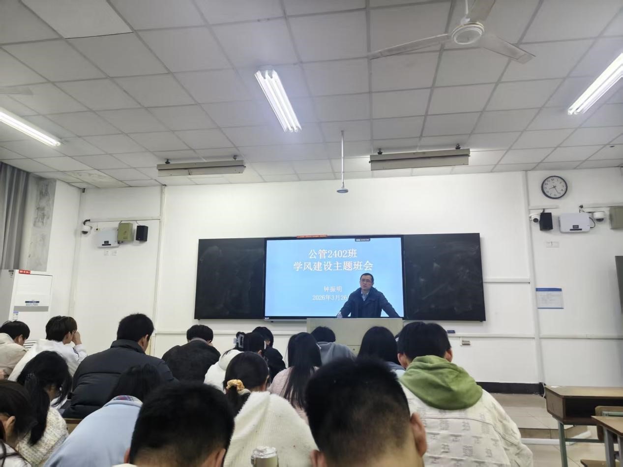 公管院3月26日电(记者 龚璇)为进一步加强班级学风建设,明确学业发展方向,3月26日,公共管理学院2402班于综南109召开学风建设主题班会。本次班会由班主任钟振明老师主讲,班级全体同学参与。